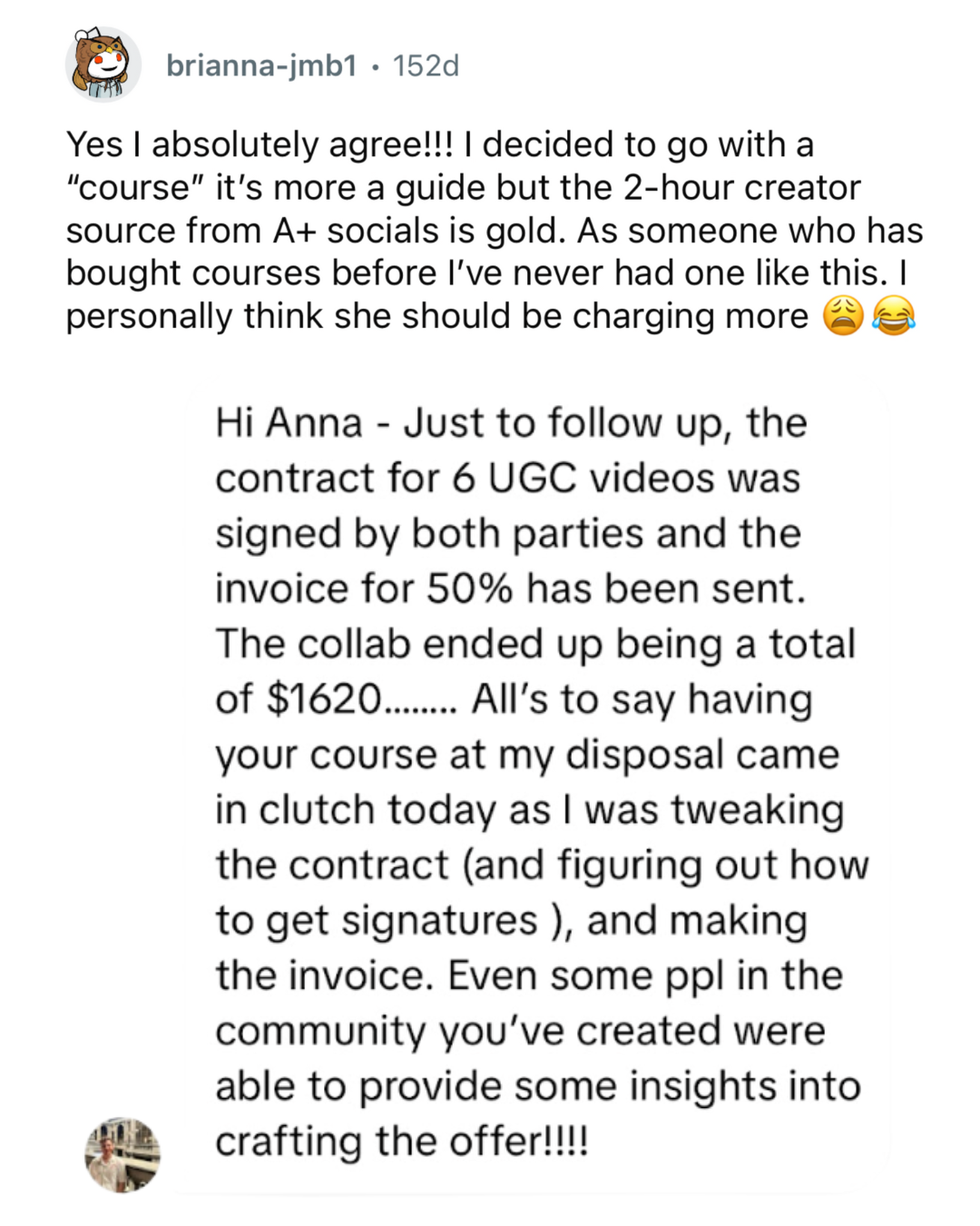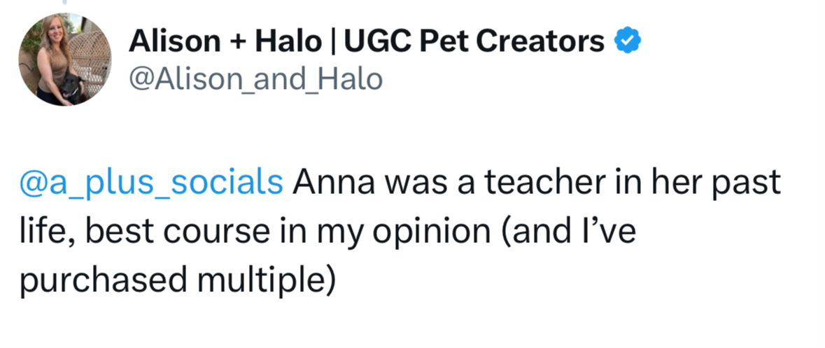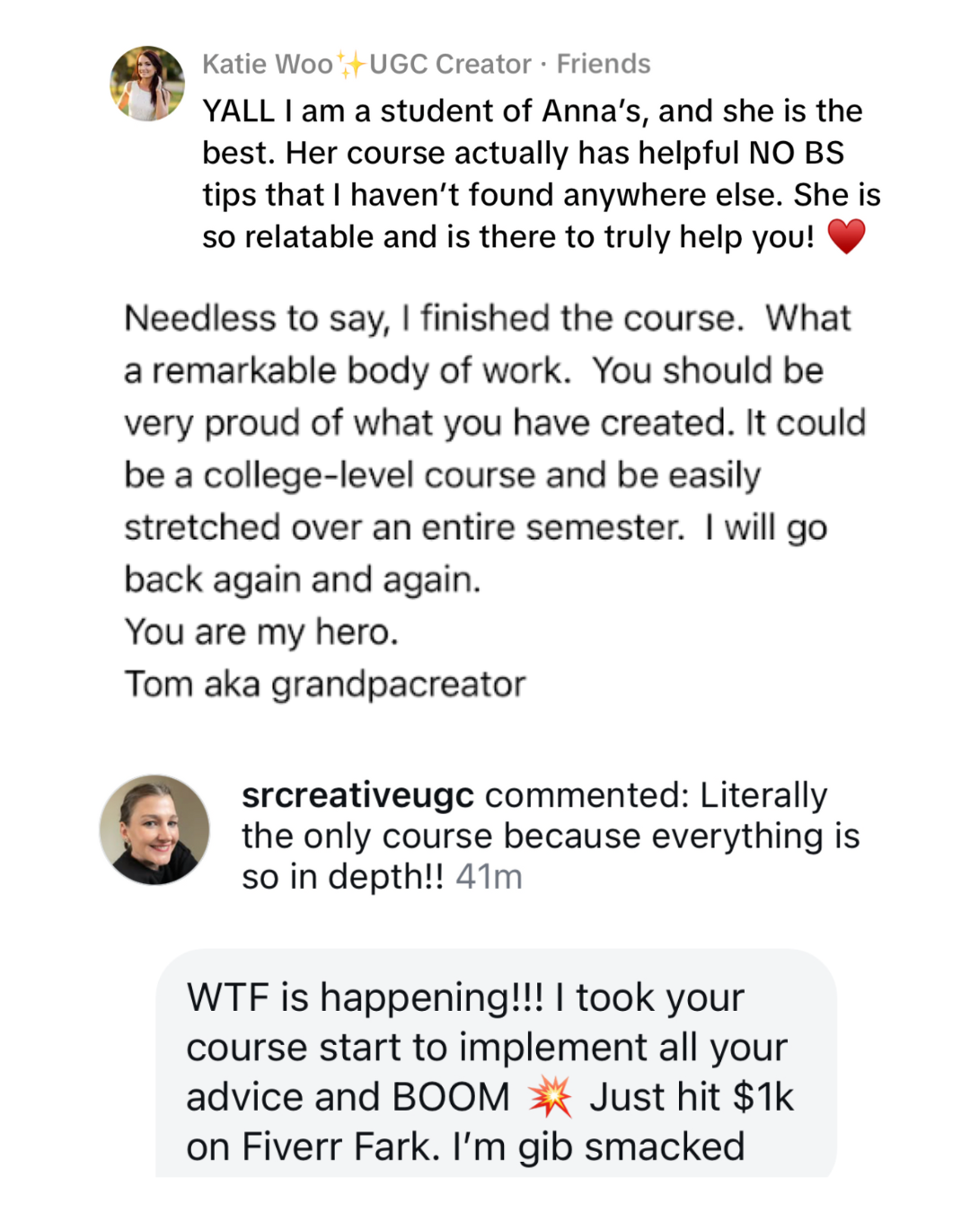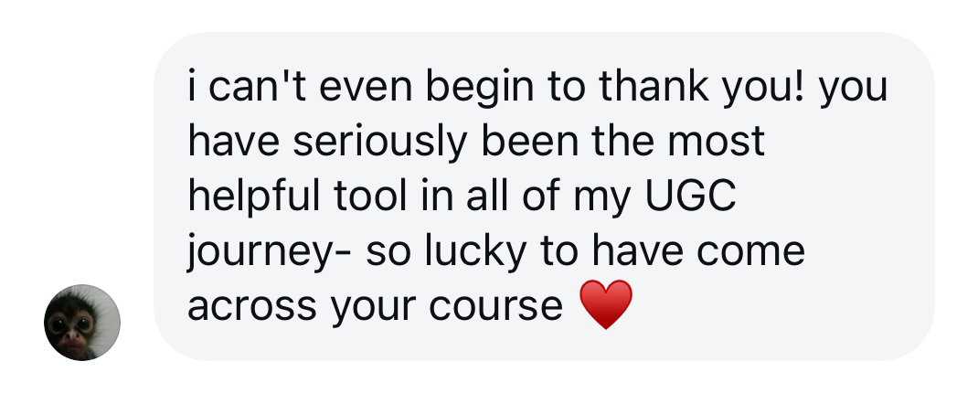"I had avoided UGC courses and pushy creators promising to change my life forever if I just ordered THEIR course or program. I found Anna doing a free live session and I learned so much in 3 minutes from her and I thought this is the person I want to learn from so I jumped into A+ Socials and the 2-hour course was exactly what I was looking for and needed as a new UGC creator. It gave me all the information I needed in small chunks that allowed me to learn at my own pace and the presentation made so much sense to me. Thank you! "