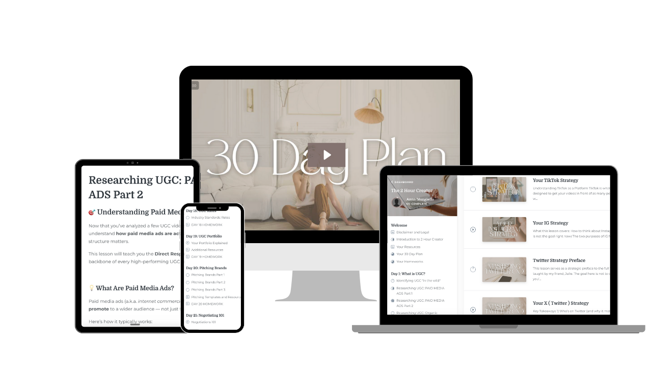 A complete 30-day step-by-step UGC program that helps you launch your business and land your first paid brand deal —