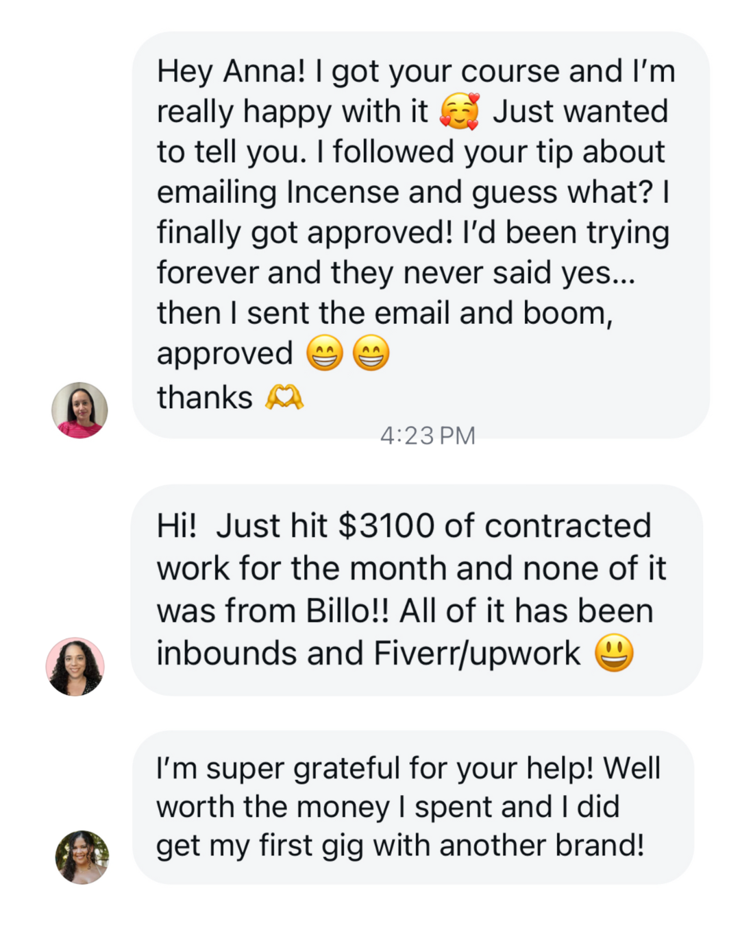 "In my first year as a UGC creator, I’ve worked with over 150 brands, have many repeat clients, and made close to $30,000, all while working full-time as a teacher and building my business (very part-time and slowly) in the evenings and weekends. Anytime someone asks me about how I got started in UGC, I immediately send them to Anna and her course. Anna is so relatable, down-to-earth, and a non- bullshitter, who is very invested in your success. "