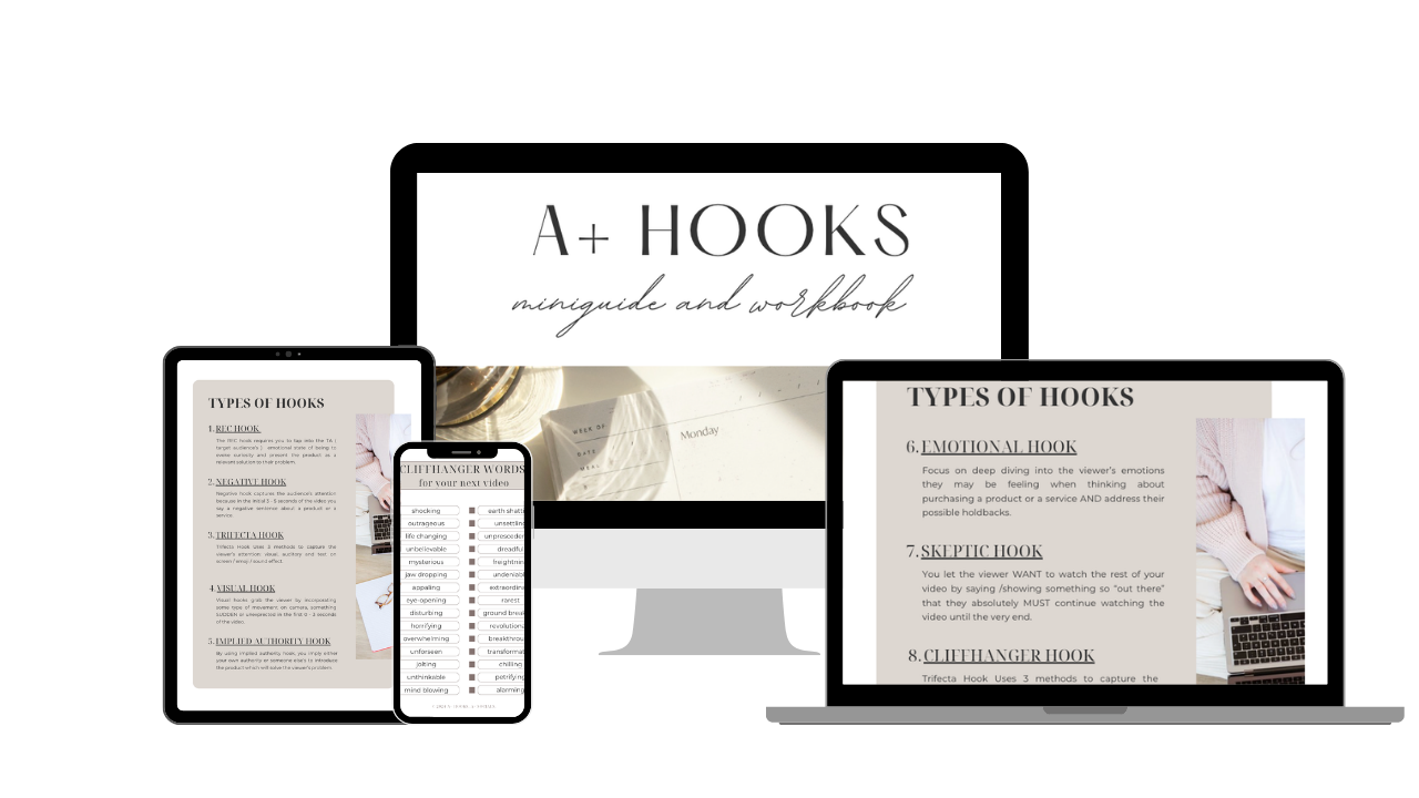 A+ Hooks teaches you the exact strategies behind scroll-stopping video openers — with 10 proven hook frameworks, real examples for each, and fill-in-the-blank practice that builds the skill in your hands, not just your head.